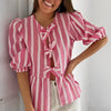Dit charmante blousje met striksluiting biedt een speelse en vrouwelijke uitstraling. De strepen en ruches aan de onderkant geven een luchtige en hip uitstraling.