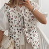 Deze luchtige mouwloze blouse straalt zachte romantiek uit dankzij het delicate bloemenmotief en de speelse strikdetails op de borst. De V-halslijn en de drieknoopsluiting in strikvorm geven het item een vrouwelijke flair met een vleugje vintage charme. De lichte stof voelt comfortabel aan en maakt deze top tot een ideale keuze voor warme dagen of als subtiele laag onder een vest of jasje.