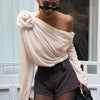 Deze elegante off-shoulder blouse straalt pure verfijning uit met haar luchtige drapering en romantisch bloemdetail op de schouder. De zachte, vloeiende stof creëert een sierlijke uitstraling, terwijl de asymmetrische snit een moderne twist toevoegt. De lange mouwen zorgen voor balans tussen speels en chic.