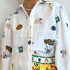 Deze wijdvallende bloes straalt een artistieke flair uit die doet denken aan moderne kunstgalerijen en zonnige zomerterrassen. De luchtige stof, waarschijnlijk een linnenblend, zorgt voor een comfortabele en elegante pasvorm, terwijl de speelse illustraties over het hele oppervlak zorgen voor een unieke en expressieve uitstraling. Je ontdekt bij elke blik nieuwe: abstracte gezichten, bloemen, sterren, manen, en symbolische vormen die samen een levendig kunstzinnig verhaal vertellen.