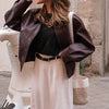 Dit cropped bomberjack combineert stoere elegantie met een moderne twist. De gestructureerde schouders en oversized pasvorm geven een krachtige uitstraling, terwijl de korte lengte een flatterend silhouet creëert. De diepe tint en subtiele glans van het materiaal voegen een tintje toe, ideaal voor zowel ongedwongen als chique uitstraling.