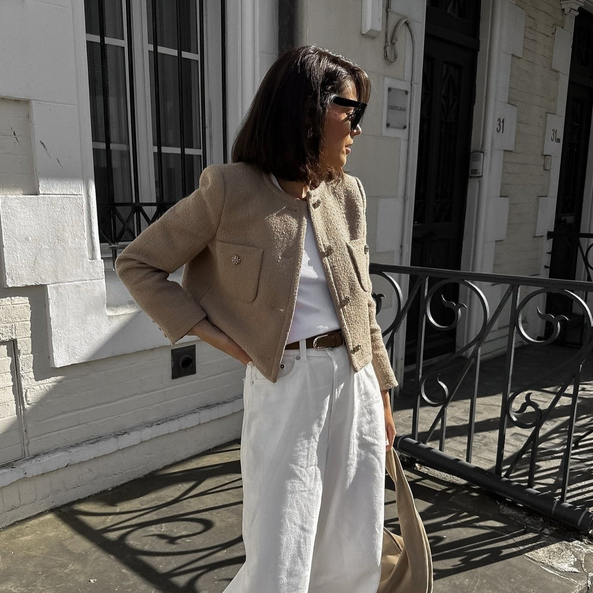 Dit jasje vormt de ideale aanvulling op je garderobe. Combineer het met een simpele jeansshort en een basic T-shirt zoals op de foto, of draag het over een fitted jurk voor een meer geraffineerde uitstraling. Dankzij de neutrale tint past het bij elke kleur en stijl – van denim tot zijde.