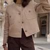 Geïnspireerd door het tijdloze Parijse straatbeeld brengt dit Bijgesneden jasje een perfecte balans tussen chic en ongedwongen. Het elegante ontwerp met een ronde halslijn en een rechte, kortere snit geeft je kleding meteen een verzorgde uitstraling. De zachte wolachtige textuur zorgt voor warmte en comfortabele, terwijl de verfijnde goudkleurige knopen een subtiele dosis glamour toevoegen. De grote opgestikte zakken aan de voorzijde zorgen voor een speelse twist en maken het geheel extra stijlvol.