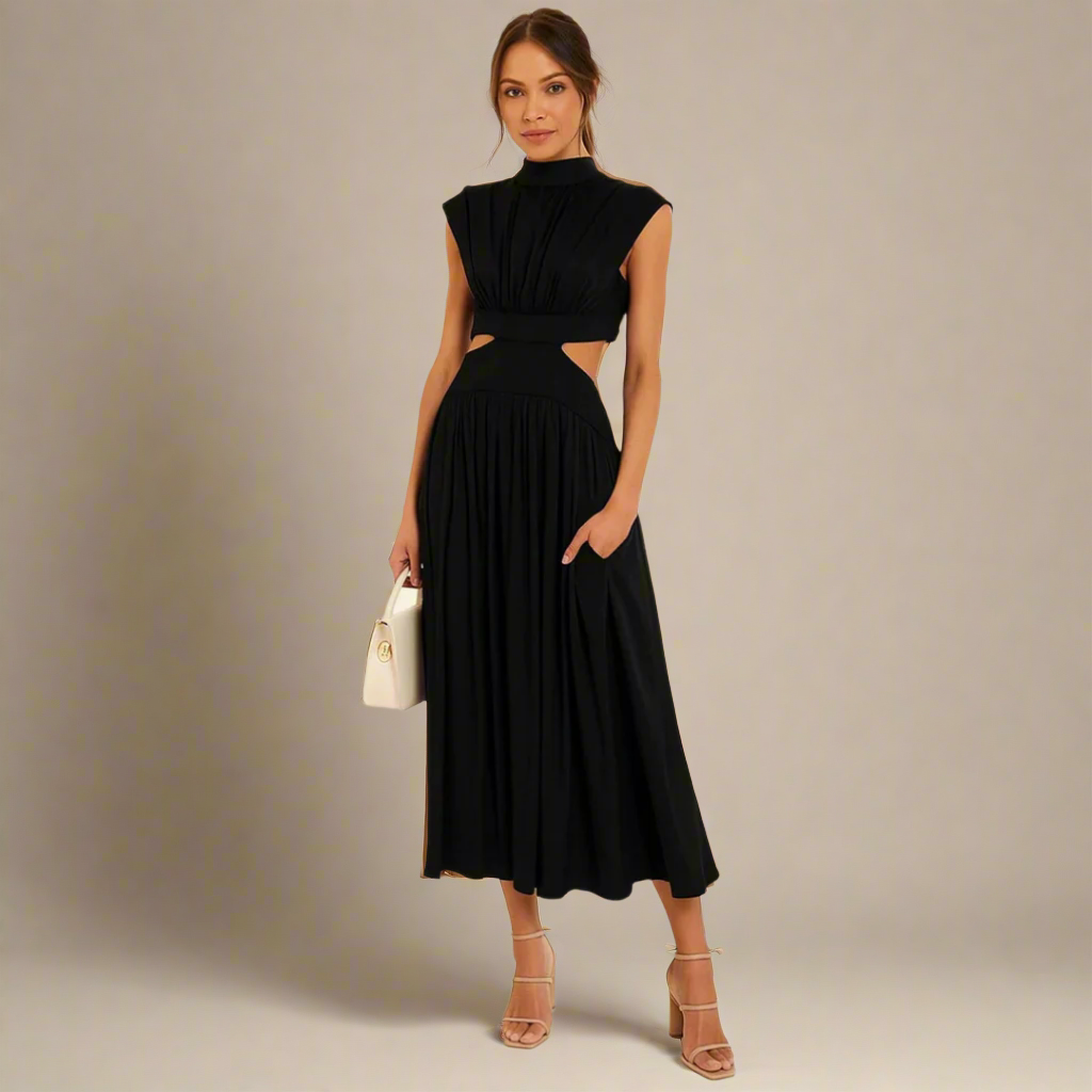 De jurk is gemaakt van licht en ademend materiaal, ideaal voor warme zomerdagen en zwoele avonden. De hoge halslijn en de elegante uitsnijdingen aan de zijkanten geven de jurk een chique en eigentijdse uitstraling. De wijde rok valt prachtig om je lichaam en biedt zowel gemak als stijl.