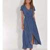 Deze charmante maxi-jurk heeft een flatterend wikkelontwerp met een elegante V-hals en een strikceintuur die de taille accentueert. De luchtige stof en korte mouwen zorgen voor een moeiteloze, zomerse uitstraling, terwijl de speelse split een vrouwelijke tintje toevoegt.