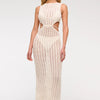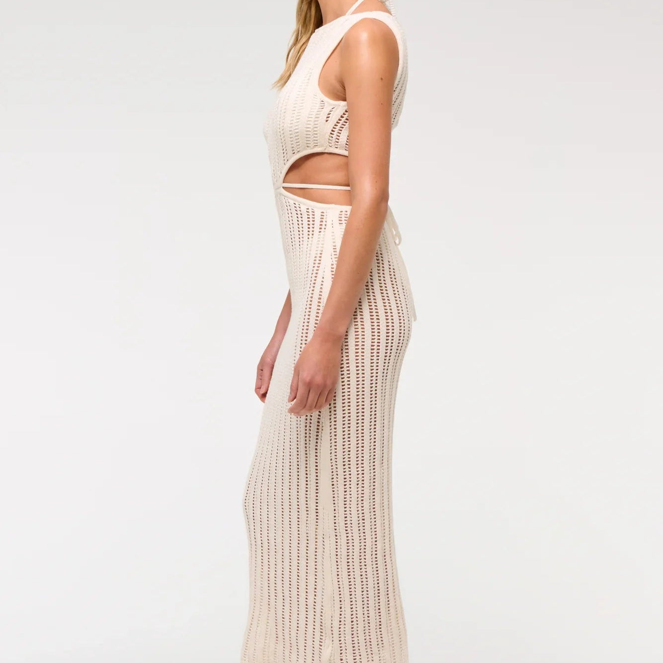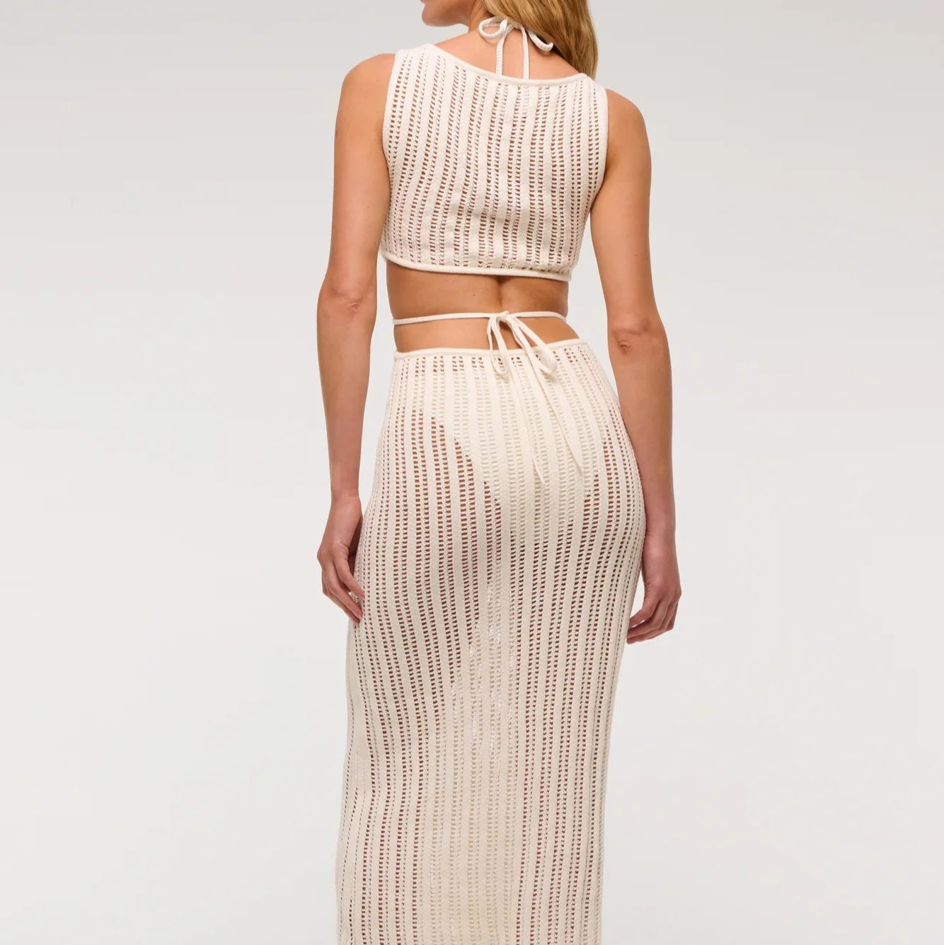 Het model is mouwloos en hooggesloten aan de hals, wat zorgt voor een mooi evenwicht met de speelse uitsnijdingen aan de zijkanten van de taille. Deze uitsnijdingen accentueren het silhouet op een flatterende manier, terwijl de rechte, midi-lengte rok een ingetogen flair behoudt. De verticale gehaakte strepen verlengen visueel het lichaam, en de rekbare stof biedt comfort en bewegingsvrijheid — ideaal om over een bikini of badpak te dragen.