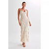 De spaghettibandjes en V-halslijn creëren een open en luchtige bovenkant, perfect in balans met de langere lengte van de rok. De rug is laag uitgesneden, wat de jurk een extra verfijnde allure geeft. Deze jurk ademt elegantie en is gemaakt voor bijzondere momenten – of je nu naar een zomerse bruiloft gaat of een speciale avond gepland hebt.