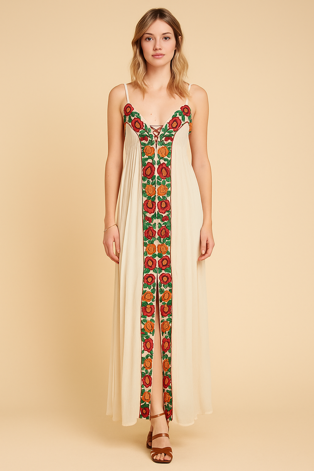 Deze bohemian maxi-jurk straalt karakter en wereldse elegantie uit, perfecte voor wie houdt van een unieke stijl met een vleugje folklore. De jurk heeft een rechte, vloeiende pasvorm en is gemaakt van een lichte stof die soepel valt en de huid laat ademen – ideaal voor warme dagen. De spaghettibandjes zorgen voor een luchtig silhouet, terwijl het opvallende borduursel in het midden de absolute eyecatcher is.