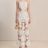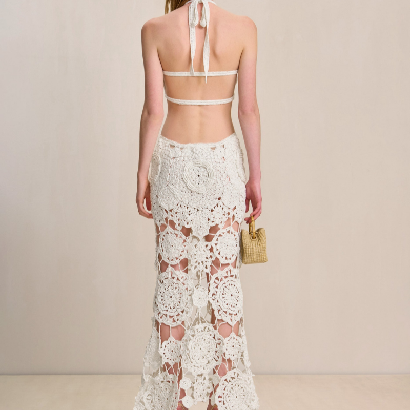Deze gehaakte halterjurk met uitsnijdingen is een artistiek meesterwerk dat vrouwelijkheid en vakmanschap op unieke wijze samenbrengt. De jurk is opgebouwd uit zorgvuldig vervaardigde, ronde haakpatronen die als bloemachtige motieven over het hele lichaam verspreid zijn. De opengewerkte structuur zorgt voor een luchtige, bijna gewichtloze uitstraling en laat op subtiele wijze huid doorschemeren, zonder aan elegantie te verliezen.