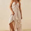 Deze gelaagde maxi-jurk met ruches is het ultieme bohemian zomerstatement. De jurk heeft een vloeiend silhouet dat elegant langs het lichaam valt, met meerdere speelse ruches die voor beweging en structuur zorgen. De halterhals zorgt voor een luchtige, open uitstraling en benadrukt de schouders en halslijn op een subtiele manier. Het bovenstuk heeft een zachte V-halslijn met fijn gedrapeerde ruches die de buste accentueren, terwijl de rest van de jurk naar beneden uitloopt in een asymmetrisch gelaagd rokgedeelte dat licht en luchtig meebeweegt bij elke stap.