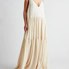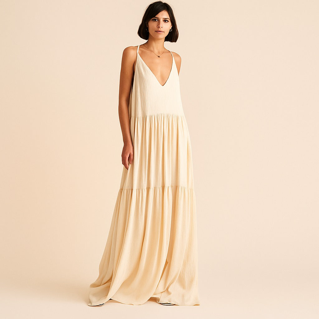 Gemaakt van een lichte en ademende stof, biedt de Wijde Maxi Jurk ultiem draagcomfort tijdens warme dagen. De wijde pasvorm en de diepe V-hals creëren een luchtig en elegant silhouet, terwijl de subtiele plooien en de vloeiende rok een vleugje romantiek toevoegen aan je uitstraling.