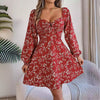 Deze prachtige jurk met bloemenprint combineert romantische gegevens met een flatterend silhouet, perfect voor verschillende gelegenheden. Het ontwerp kenmerkt zich door een diepe V-hals met sierlijke ruches die langs de halslijn doorlopen, wat een vrouwelijk en verfijnd accent geeft. De lange mouwen met elastische manchetten voegen een elegante touch toe, terwijl de subtiele bloemetjesprint zorgt voor een speelse uitstraling.