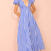 Gemaakt van een luchtige, maar gestructureerde stof valt de jurk soepel langs het lichaam, terwijl de taille subtiel geaccentueerd wordt. De zwierige rok met vloeiende lijnen beweegt mee bij elke stap, wat een gevoel van lichtheid en gratie creëert. Het kleurenpalet met contrasterende strepen geeft een frisse uitstraling en maakt het een ideaal item voor zonnige dagen, vakanties of speciale buitengelegenheden.