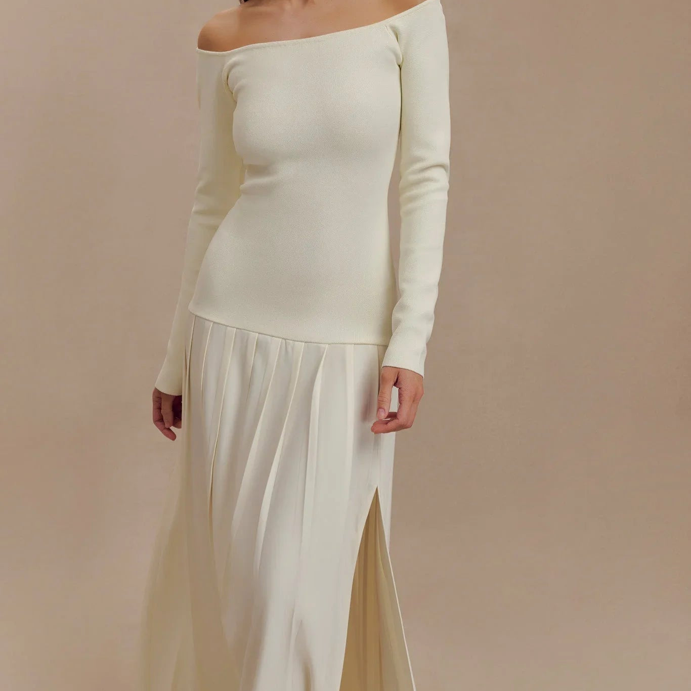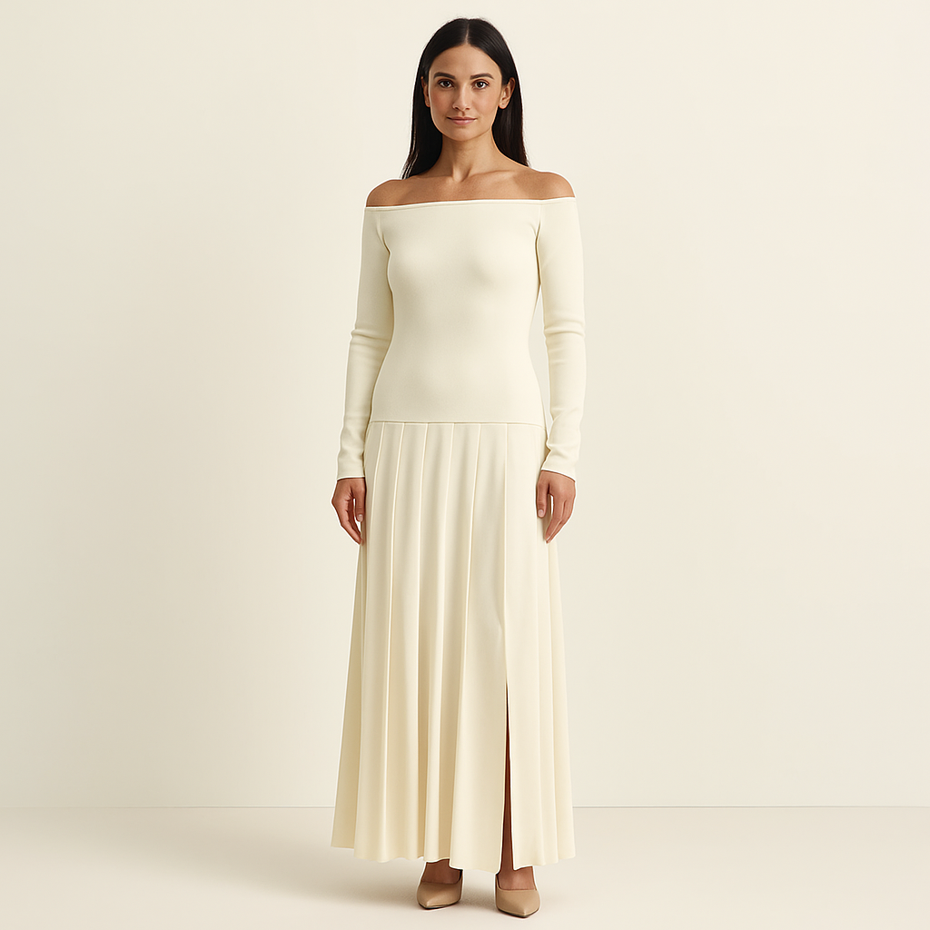 Deze maxi jurk ademt pure elegantie en tijdloze schoonheid. De nauwsluitende bovenkant benadrukt op subtiele wijze het vrouwelijke silhouet, terwijl de off-schouderlijn een verfijnde en romantische uitstraling geeft. De lange mouwen zorgen voor een sierlijke balans tussen ingetogen klasse en moderne verfijning, waardoor de jurk perfect is voor uiteenlopende gelegenheden.