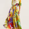 Deze lange jurk is een waar kunstwerk in beweging. De opvallende abstracte print combineert levendige tinten in een wervelend patroon dat meteen de aandacht trekt. Van felle accenten tot zachte overgangen – elk detail straalt creativiteit en zomerse energie uit. De soepel vallende stof beweegt elegant met elke stap, en de vloeiende lijnen geven een gevoel van vrijheid en expressie.