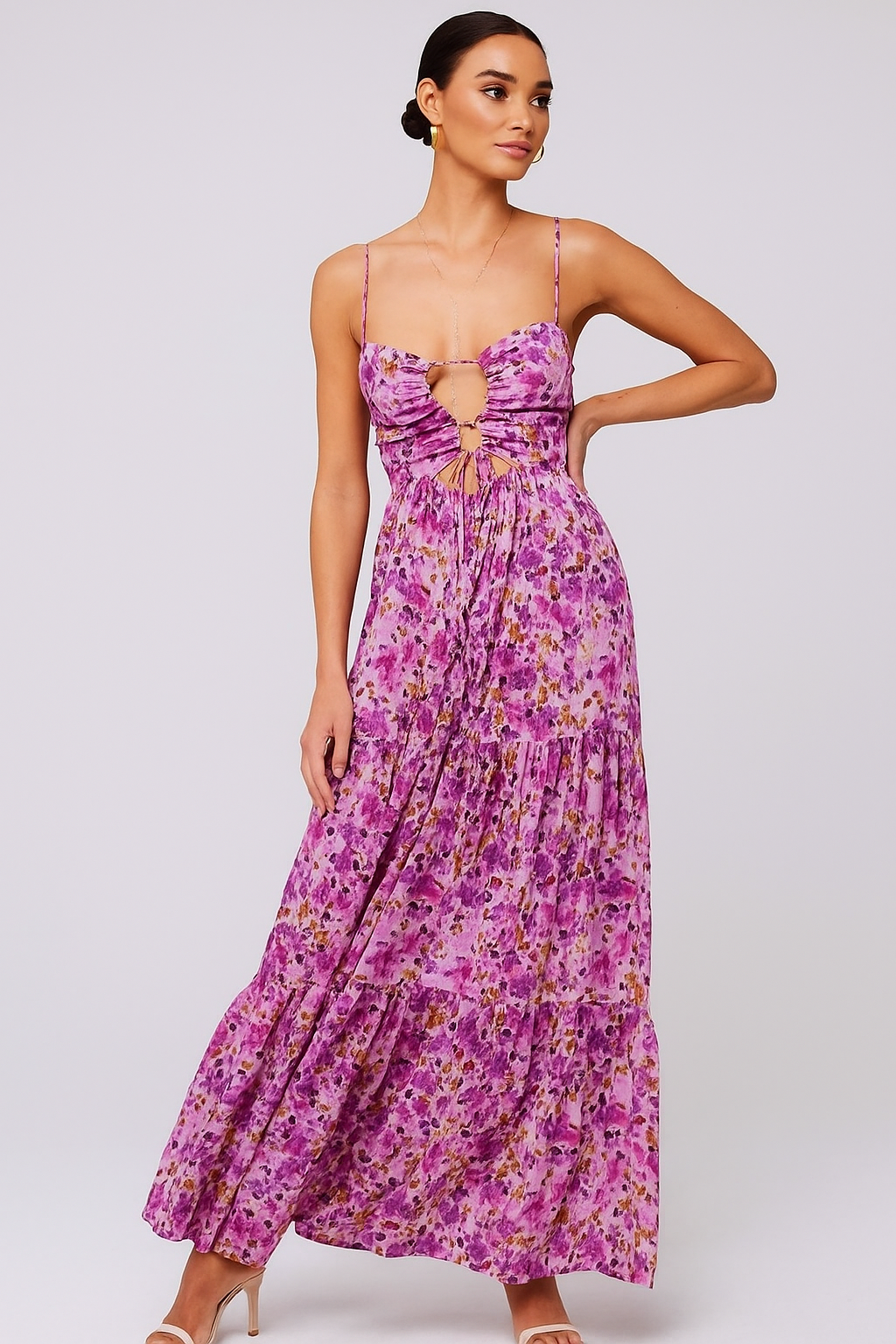 Deze lange jurk met bloemenprint en rimpeldetail is een zomerse blikvanger die comfort en stijl naadloos combineert. Het bovenstuk is voorzien van een subtiel plooidetail met een striksluiting midden op de borst, waardoor een speelse uitsnijding ontstaat die net dat beetje extra allure toevoegt. De dunne verstelbare schouderbandjes zorgen voor een elegante en luchtige uitstraling, terwijl het lijfje mooi aansluit voor een flatterende pasvorm.