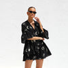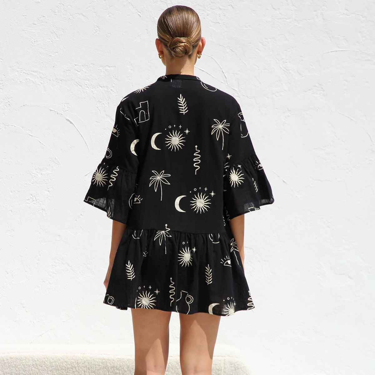 Deze losvallende mini-jurk met zon-en-maanprint is een expressief statementstuk dat moeiteloos comfort en karakter combineert. Het luchtige silhouet, gemaakt van een soepel vallende stof, valt losjes om het lichaam en zorgt voor een speels, bohemien gevoel. De zwarte achtergrond vormt een krachtig canvas voor de crèmekleurige symbolen – een eclectische mix van zonnen, manen, sterren, vazen en abstracte lijnen die een mystieke, bijna kosmische sfeer oproepen.