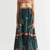 Deze opvallende maxi-jurk ademt zomerse flair en artistieke expressie. De jurk is voorzien van fijne schouderbandjes en een rechte halslijn, waardoor het bovenlichaam elegant wordt omlijst. Het bovenstuk springt direct in het oog dankzij de zonnebloemaccenten die als borduursel zijn verwerkt op een contrasterend crèmekleurig paneel. De speelse rode rand met etnisch geïnspireerd patroon benadrukt het bohemien karakter van de jurk.