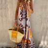 Deze maxi-jurk met etnische print ademt zorgeloze zomerse vibes en is een ideale keuze voor wie houdt van comfort met karakter. Het losvallende silhouet en het luchtige materiaal zorgen voor ultieme bewegingsvrijheid, waardoor je zelfs op de warmste dagen stijlvol én koel blijft. De jurk heeft een rechte halslijn met dunne verstelbare bandjes die een vrouwelijke en nonchalante uitstraling geven. De etnisch geïnspireerde print in warme tonen van oranje, bruin en geel komt prachtig tot leven tegen de zachte grijze achtergrond, wat het geheel een bohemian en tegelijk moderne feel geeft.