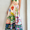 Deze sprookjesachtige maxi-jurk is een ware eyecatcher en brengt een speelse fantasiewereld tot leven. De jurk is uitgevoerd in een luchtige, soepel vallende stof die heerlijk draagt op warme dagen. Wat deze jurk echt bijzonder maakt, is de betoverende carnavalprint die doet denken aan een kleurrijk droomfestival vol mythische figuren, magische landschappen en surrealistische symbolen. Van prikkelende ogen en vurige harten tot galopperende paarden en sierlijke zeemeerminnen—elk gegevens op de print nodigt uit tot kijken en verwonderen.