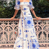 Wat deze jurk écht bijzonder maakt, is de artistieke print in helder blauw, die doet denken aan mediterrane tegels of traditioneel aardewerk. De opvallende patronen zijn strategisch geplaatst voor een harmonieus effect en maken van deze jurk een echte blikvanger. De zoom van de rok heeft een brede ruche die extra volume en speelsheid toevoegt, wat bijdraagt aan de charme van het geheel.