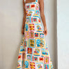 Deze maxi-jurk met vierkante hals en tropische print is het ultieme kledingstuk voor iedereen die van zon, zee en zomerse vrolijkheid houdt. De jurk is voorzien van een speelse en kleurrijke print, gevuld met tropische motieven zoals palmbomen, ankers, zeesterren, ananassen en zonsondergangen. Elk blok in de print voelt als een vakantiekaartje, wat deze jurk een unieke en levendige uitstraling geeft.
