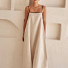 Deze maxi-jurk met zwarte biezen is het toonbeeld van minimalistische elegantie. Met haar luchtige pasvorm en vloeiende silhouet is deze jurk een stijlvolle keuze voor warme dagen, zomervakanties of ontspannen momenten. De jurk valt soepel over het lichaam en biedt volop bewegingsvrijheid, terwijl de rechte halslijn met fijne zwarte bies een subtiele maar opvallende accentlijn toevoegt. De spaghettibandjes zijn verfijnd en zorgen voor een elegante tintje zonder overdaad.