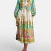 Deze midi-jurk met paisleyprint en ceintuur straalt pure elegantie uit met een speelse knipoog naar klassieke bohemien-invloeden. Het ontwerp valt direct op door het rijke kleurenpalet met tinten van turquoise, zonnig geel, roze en oranje, gecombineerd in een betoverende paisleyprint die doet denken aan vakantiebestemmingen en mediterrane markten. De jurk heeft een recht silhouet dat dankzij de afneembare ceintuur prachtig getailleerd kan worden, waardoor je je figuur elegant accentueert.