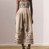 Deze elegante midi-jurk met spaghettibandjes is een verfijnde keuze voor vrouwen die houden van een vrouwelijke, artistieke stijl. Het ontwerp valt op door het gebruik van borduursels in contrasterende kleur, die een speelse en toch stijlvolle uitstraling geven. De jurk heeft een strak lijfje dat prachtig aansluit en de taille accentueert, terwijl het rokdeel losjes uitloopt in een flatterende A-lijn. De borduursels zijn zorgvuldig aangebracht en vormen een bloemachtig patroon dat over het bovenstuk en de rok doorloopt, waardoor het geheel een ambachtelijke flair krijgt.