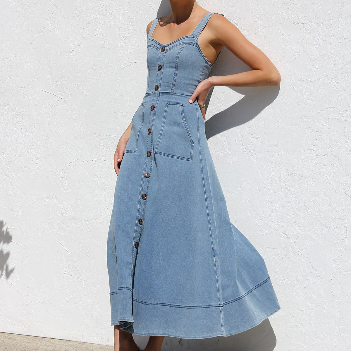Deze mouwloze knoopjurk met steekzakken is een stijlvolle en praktische keuze voor wie houdt van een ongedwongen maar verzorgde uitstraling. Het denimachtige materiaal zorgt voor een robuuste, speelse uitstraling die tegelijkertijd vrouwelijk en tijdloos is. De jurk sluit nauw aan rond het bovenlichaam en accentueert de taille, waarna de rok soepel uitwaaiert tot net boven de enkels – een flatterend A-lijn silhouet dat zowel comfortabele als elegantie biedt.