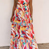 Breng kleur en levendigheid in je garderobe met deze opvallende mouwloze maxi-jurk met een speelse print. Het kleurrijke ontwerp en de vloeiende pasvorm maken deze jurk tot een perfecte keuze voor zomerse dagen, vakanties of feestelijke gelegenheden. De jurk heeft een vierkante halslijn die zorgt voor een moderne uitstraling en schouderbandjes met charmante strikdetails die een speels accent toevoegen.