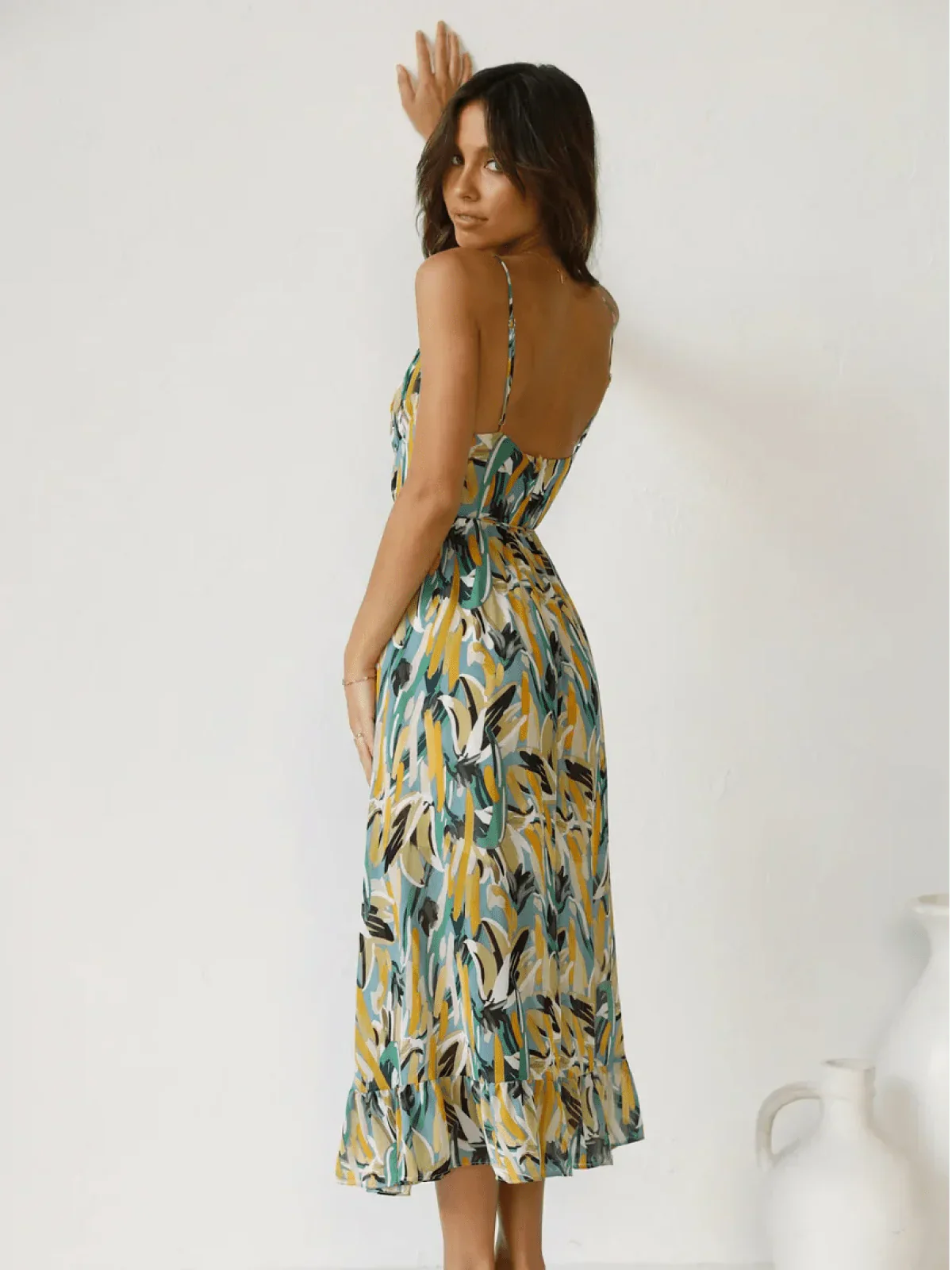 Deze luchtige maxi jurk met spaghettibandjes straalt moeiteloze elegantie uit. De vloeiende pasvorm en speelse gegevens maken het een perfecte keuze voor zomerse dagen en ontspannen avonden.