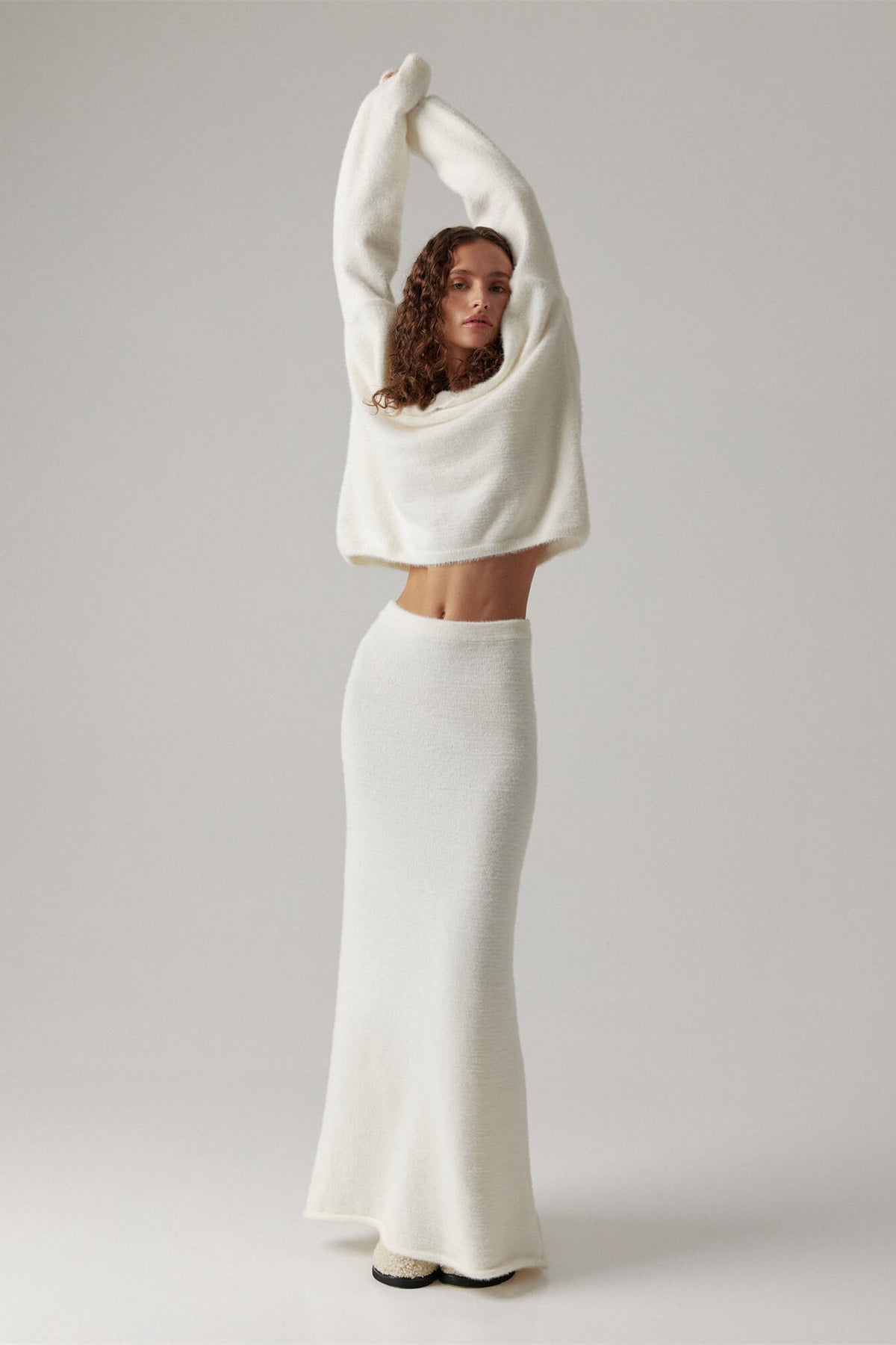 Deze zachte en comfortabele gebreide set is perfecte voor een ontspannen maar stijlvolle uitstraling. De oversized trui en lange rok bieden een minimalistische elegantie met een moderne twist. Het materiaal voelt heerlijk aan op de huid en is ideaal voor koelere dagen.