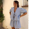 Deze luchtige set straalt een charmante, zomerse eenvoud uit met een knipoog naar nostalgische stijlen. Het ensemble bestaat uit een kort broekje en een ruimvallende blouse met korte pofmouwen en een diepe V-hals die met speelse striksluitingen wordt samengebonden. De subtiele ruitjesprint in een frisse, klassieke kleurcombinatie geeft het geheel een landelijke flair die doet denken aan zonnige dagen op het platteland of een stijlvolle picknick in het park.