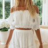 De bijpassende rok valt soepel en vloeiend over de benen, met een elastische tailleband die zorgt voor draagcomfort en bewegingsvrijheid. De lichte, transparante stof geeft een zwierige uitstraling en laat net genoeg doorschijnen voor een subtiel sensueel effect. Deze set is perfect voor warme zomerdagen, een picknick in het park of een vakantie aan zee.