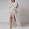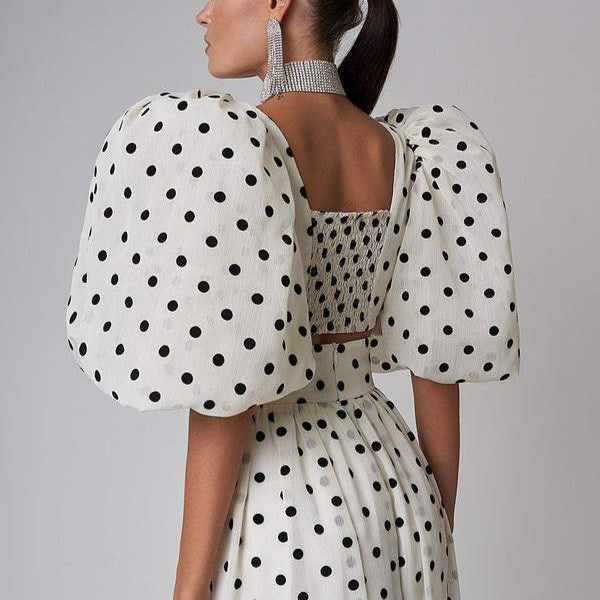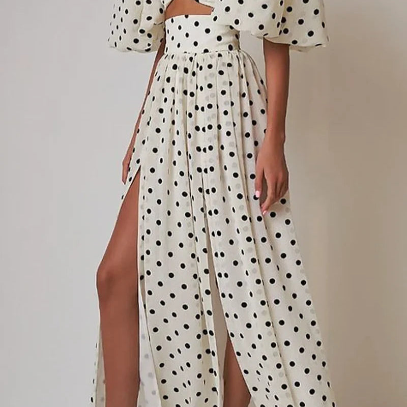 De bijpassende maxi-rok is hoog getailleerd voor een flatterend effect en valt vloeiend over de heupen. De dubbele hoge splitten aan de voorkant voegen een gewaagd accent toe en zorgen voor een luchtige, zwierige beweging bij het lopen. De gehele set is bedekt met een tijdloos stippenpatroon, wat het geheel een retro-geïnspireerde uitstraling geeft zonder aan moderniteit in te boeten.