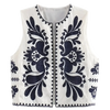 Dit gilet met zwart-witte folkloreprint brengt klassieke elegantie en volkskunst samen in één krachtig statement piece. De mouwloze snit en rechte lijnen zorgen voor een tijdloze pasvorm die gemakkelijk over andere kleding gedragen kan worden. De witte achtergrond vormt een helder canvas voor de rijke zwarte borduursels die doen denken aan traditionele Oost-Europese of Scandinavische patronen. Grote, gestileerde bloemmotieven lopen symmetrisch over de voorzijde, omlijst door een decoratieve rand die het geheel een extra verfijnde uitstraling geeft.