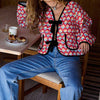 Dit gewatteerde jack met levendige print brengt comfort en stijl samen in een uniek ontwerp. De striksluiting aan de voorkant en contrasterende biezen geven het een speelse en verfijnde uitstraling. De zachte vulling zorgt voor extra warmte, terwijl de losse pasvorm ideaal is voor laagjescombinaties.