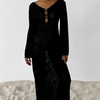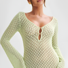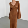 Deze verfijnde maxi-jurk straalt moeiteloze elegantie uit met haar opengewerkte textuur en flatterende silhouet. De diepe V-hals en subtiele striksluiting aan de voorkant zorgen voor een vrouwelijke en verleidelijke uitstraling, terwijl de lange mouwen met een lichte flare een speelse tintje toevoegen. De rekbare stof biedt een perfecte pasvorm en ultiem draagcomfort.