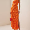 Deze verleidelijke jurk is gemaakt voor dansvloeren, zomeravonden en feestelijke momenten waarop je wilt stralen. De diagonale ruches zorgen voor een levendige en sensuele dynamiek, die bij elke beweging meespeelt en de jurk een speelse flair geeft. De asymmetrische snit met een subtiele split aan de zijkant maakt de look nóg expressiever en verleidelijker, zonder over de top te zijn. De rechte halslijn met spaghettibandjes zorgt voor een minimalistisch bovenstuk dat mooi contrasteert met de uitbundige ruches.