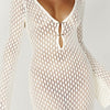 Deze verfijnde lange jurk met gehaakte gegevens straalt pure elegantie uit. Het nauwsluitende silhouet accentueert de vormen, terwijl de luchtige haakwerkstof een speelse en uitstraling geeft. De diepe V-hals met knoopsluiting voegt een vleugje sensualiteit toe, en de wijde mouwen creëren een dramatisch en vloeiend effect.