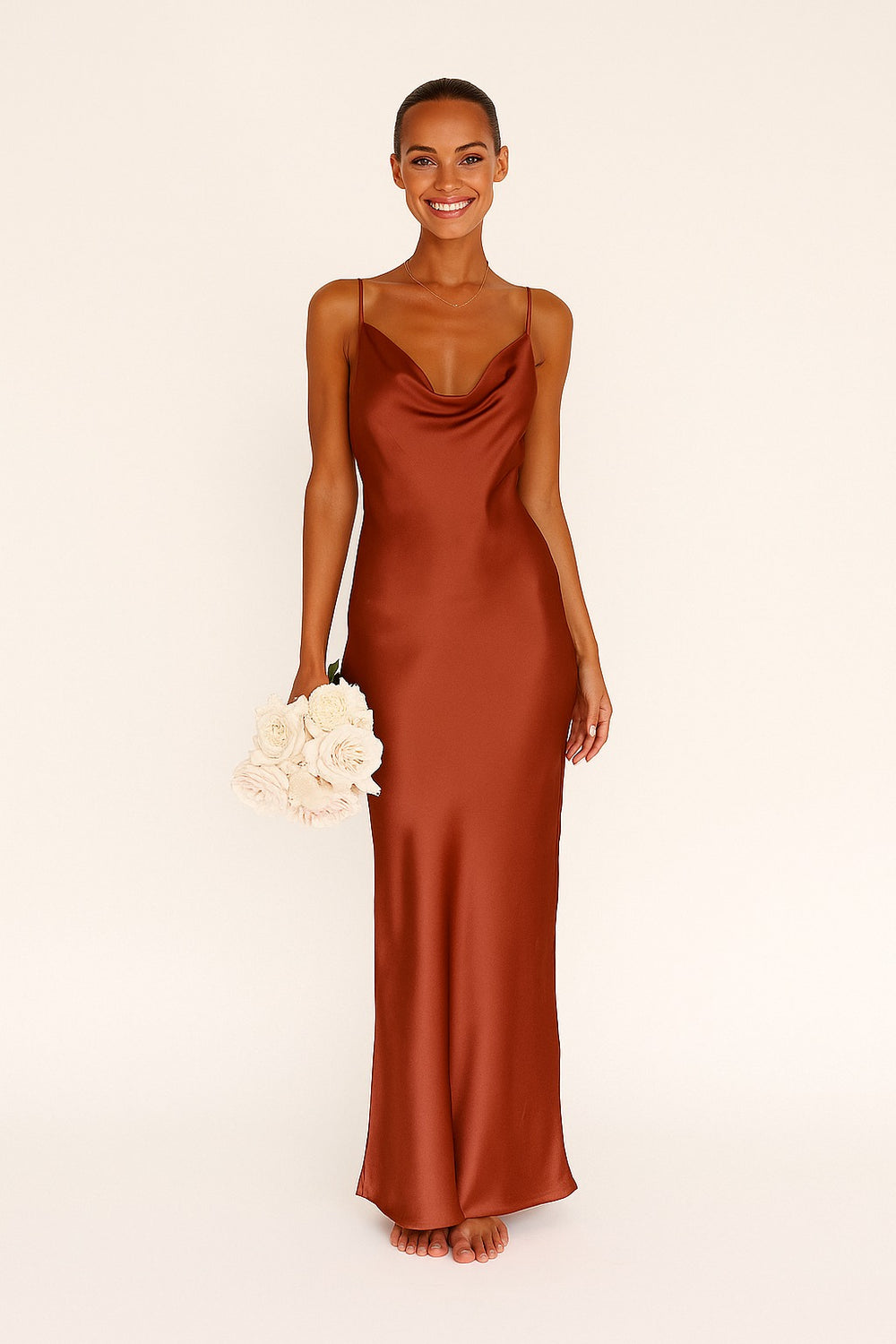 Dankzij de glanzende, gladde afwerking krijgt de jurk een luxueuze uitstraling die schittert bij elke lichtval — ideaal voor avondmomenten waarbij stijl en allure centraal staan.