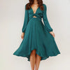Deze verfijnde midi-jurk straalt elegantie uit met zijn gedraaide front en flatterende pasvorm. De diepe V-hals en subtiele uitgesneden gegevens voegen een vleugje allure toe, terwijl de lange mouwen en asymmetrische zoom de jurk een speelse en stijlvolle uitstraling geven. De vloeiende stof zorgt voor een sierlijke beweging bij elke stap.