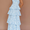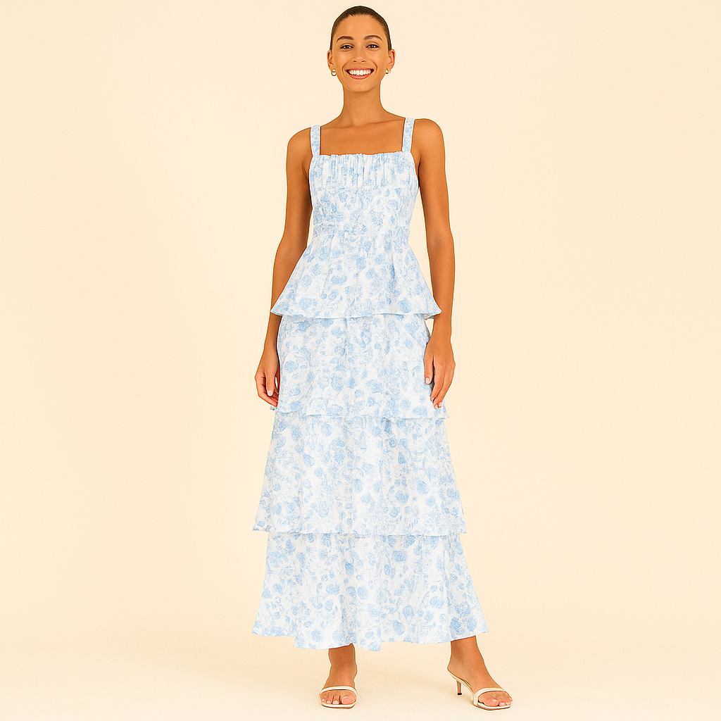 Deze gelaagde maxi-jurk met bloemenprint en smalle bandjes is een ode aan romantiek en elegantie, perfect voor lange zomerdagen of sfeervolle avonden. De jurk heeft een aansluitend lijfje met een zachte, licht geplooide buste en een licht uitlopend silhouet dat zich geleidelijk opent in meerdere lagen. Elk laagje is subtiel gerimpeld, wat zorgt voor een speels en vloeiend effect tijdens het lopen. Het bloemenpatroon draagt bij aan de dromerige uitstraling, terwijl de strakke bandjes een verfijnd en luchtig accent geven.