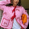 Dit charmante gewatteerde jack combineert speelse details met een comfortabele pasvorm. De striksluiting aan de voorkant en de sierlijke strikjes geven een romantische uitstraling, terwijl de doorgestikte stof zorgt voor extra warmte. De contrasterende afwerking voegt een opvallend tintje toe aan dit unieke ontwerp.