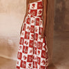 Deze maxi-jurk met asymmetrische hals is een stijlvolle ode aan zomerse elegantie en artistieke flair. Het unieke ontwerp met één schouderband straalt een subtiele, moderne sensualiteit uit, terwijl de rechte lijn van de top prachtig contrasteert met de volumineuze A-lijn rok. De stof is versierd met een opvallende, vintage-geïnspireerde print in een patroon van geruite vlakken, gevuld met botanische illustraties van bloemen en vruchten, wat een nostalgisch maar eigentijds gevoel oproept.