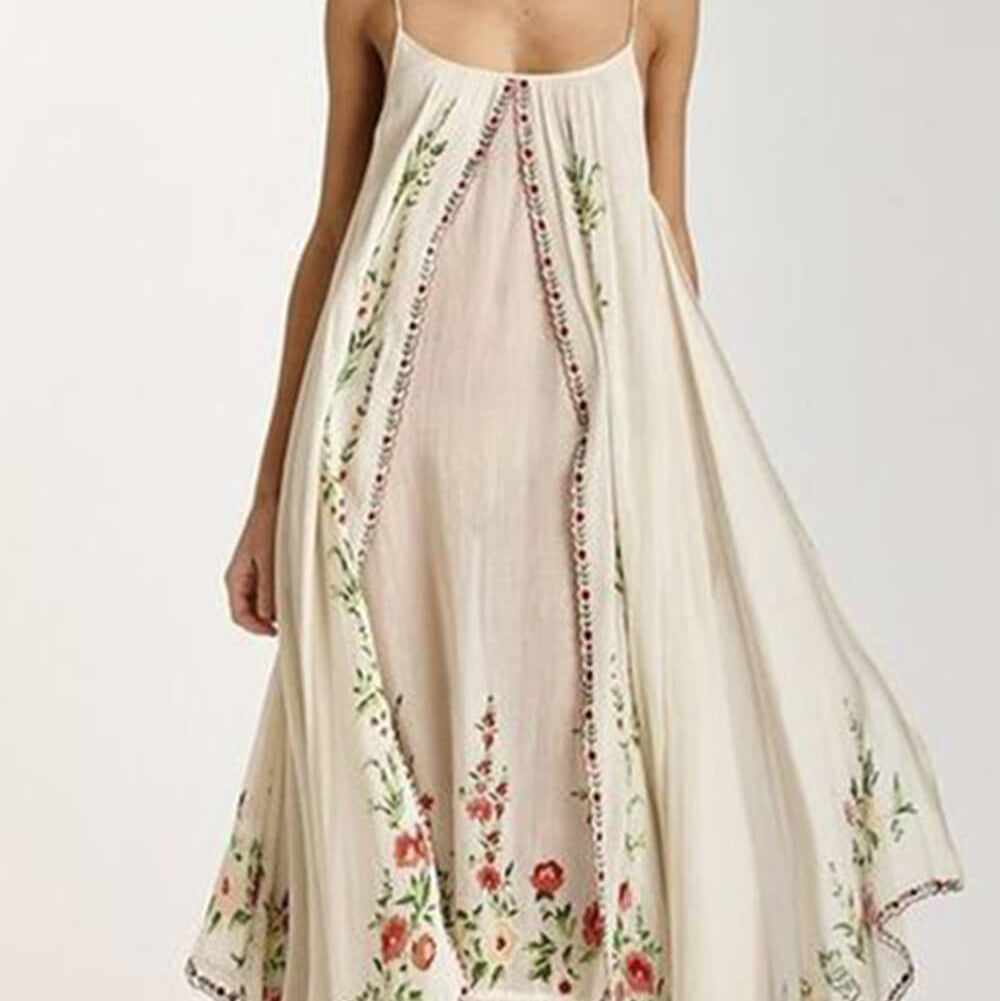 De bloemenmotieven, die doen denken aan veldbloemen of vintage borduurwerk, geven deze jurk een bohemien karakter zonder overdadig te worden. Dankzij de natuurlijke kleuren en het vloeiende materiaal voelt de jurk zowel chic als relaxed aan. Je kunt hem dragen op blote voeten op het strand of combineren met sandalen of espadrilles voor een zomerse stadswandeling.