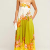 Deze luchtige maxi-jurk vangt de essentie van een zonovergoten weide in volle bloei. Met haar subtiele overgang van wit naar limoen- en zonnebloemgeel straalt de jurk pure zomerse vrolijkheid uit. De kleurrijke bloemenprint met zachte roze, oranje en gele tinten lijkt haast geschilderd, waardoor de jurk een artistieke en romantische uitstraling krijgt.