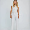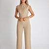 Deze elegante jumpsuit combineert stijl en comfort in een tijdloos ontwerp. De mouwloze snit en hoge halslijn geven een verfijnde uitstraling, terwijl de ceintuur in de taille zorgt voor een mooi gedefinieerd silhouet. De wijde pijpen voegen een vleugje klasse en beweging toe, perfect voor zowel formele als ongedwongen gelegenheden.