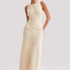 De ronde halslijn en mouwloze snit geven de jurk een frisse en luchtige uitstraling, perfecte voor zonnige dagen of formele gelegenheden met een ongedwongen insteek. Op taillehoogte zijn twee klepzakken met knoopsluiting subtiel geplaatst, wat het geheel een speelse en praktische touch geeft zonder afbreuk te doen aan de verfijning.